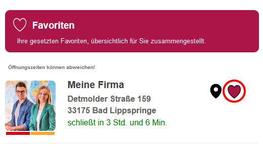 Über den Herz-Button, der an jedem Standort direkt neben dem schwarzen Standort-Button zu finden ist, lassen sich Standorte als Favoriten markieren. Danach erscheinen sie auch unter dem Menüpunkt Favoriten. Da das Markieren der Favoriten nicht an einen Login gebunden ist, sind diese an das benutzte Gerät gebunden.