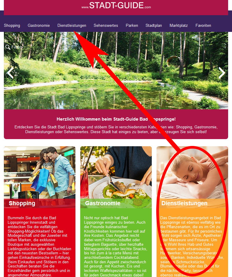 Diese bewerben die Stadt und erklären die Kategorien des Stadt-Guides, die auch in der Navigationleiste (blaue Zeile) angezeigt werden. Durch einen Klick werden jeweilige Funktionen aufgerufen.