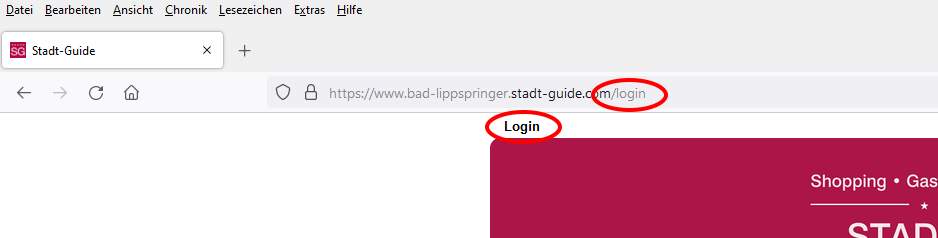 Den direktesten Weg finden Sie, indem sie „/login“ an die Webseiten-URL anhängen oder den Login-Link in der oberen linken Ecke des Stadt-Guides verwenden. Also: