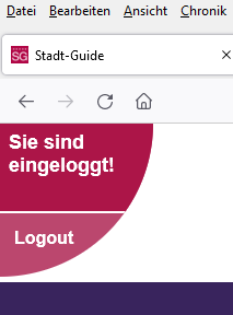 Im Kugel-Menü in der oberen linken Ecke des Stadt-Guides finden Sie den Logout-Button, sowie gegebenenfalls, abhängig von der Seite auf der Sie sich befinden, Links zu weiteren Funktionen des Backends.