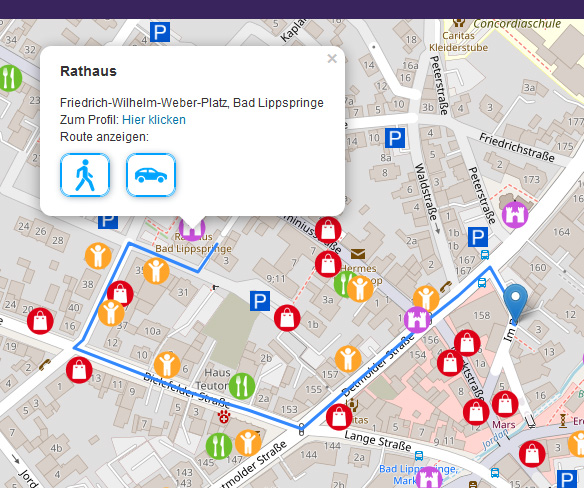 Bei gedrückter linker Maustaste kann der Positionsmarker von Hand verschoben werden. Er dient als Ausgangspunkt für die Routenführung. Wird der Marker eines Standorts ausgewählt, werden die Adresse und ein Link zurück zum Standortprofil angezeigt. Mit den Buttons für Fußgänger und Auto, kann eine Route zwischen dem Positionsmarker und dem Standortmarker angezeigt werden.