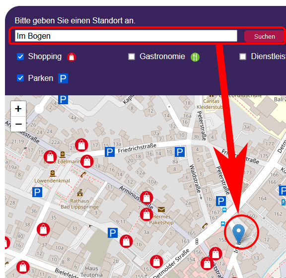 Im Suchfeld (oben links) lassen sich Straßennamen suchen. Der Positionsmarker wird dorthin verschoben, sofern ein passender Straßenname gefunden wurde. Diese Suche ist auf die Stadt beschränkt. Um Straßen in einer anderen Stadt zu suchen, muss diese, mit Komma getrennt angegeben werden, z. B. „Fürstenallee, Paderborn“.