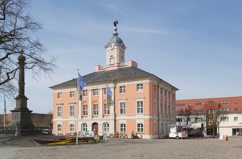 Mittelpunkt des Marktplatzes ist das Historische Rathaus. Das dreigeschossige Gebäude stammt aus der Mitte des 18. Jahrhunderts. Nach einem Stadtbrand wurde es auf den Grundmauern neu errichtet. Der Entwurf der Fassade ist von Johann Gottfried Kemmenter. Das Rathaus hat einen Adler auf der Turmspitze, dessen goldene Krone im Mittelalter abgeschossen wurde und vor einigen Jahren durch einen privaten Spender wieder aufgesetzt werden konnte. In der Mitte des Marktplatzes erhebt sich ein Kriegerdenkmal, eine Säule mit Kugel und eisernem Kreuz auf einem Sockel.